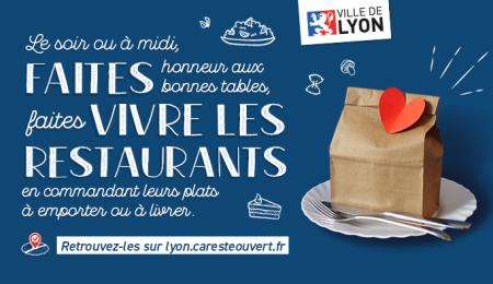 La plateforme lyon.caresteouvert.fr recense les restaurateurs désireux de d'ouvrir leurs cuisines pour la confection de repas facilement transportables, pour proposer de commander en ligne et de retirer sur place.