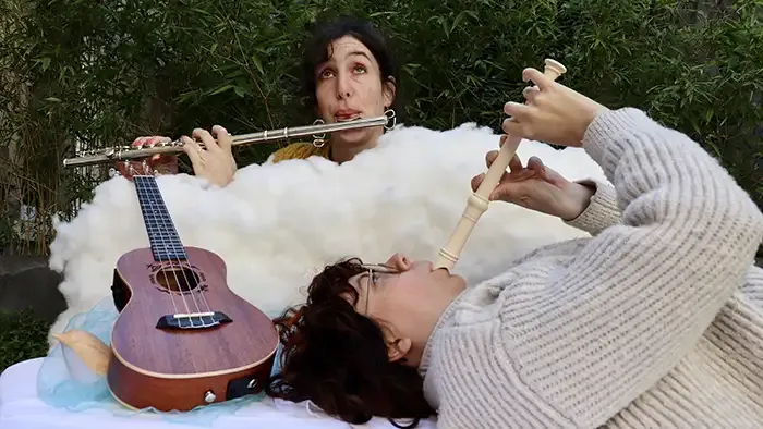 Accompagnées par un nuage cotonneux et un oiseau lumineux, nos deux artistes musiciennes explorent le corps, les sons, la marche et le chant. Guidées par deux voix qui se mêlent et interpellent, petites et grandes oreilles embarqueront à la découverte des sons profonds du bendir, des mélodies célestes des flûtes, des échos aériens des lames colorées, des notes douces et chaleureuses du ukulélé.