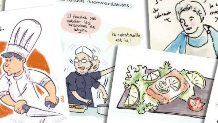 Exposition « La BD s’invite dans le Cuizin’Tour ». Anjale, Simon Caruso et Leah Touitou ont assisté pendant une année au Cuzin’tour, concours de cuisine professionnelle, organisé par la Fondation OVE (association médico-social).