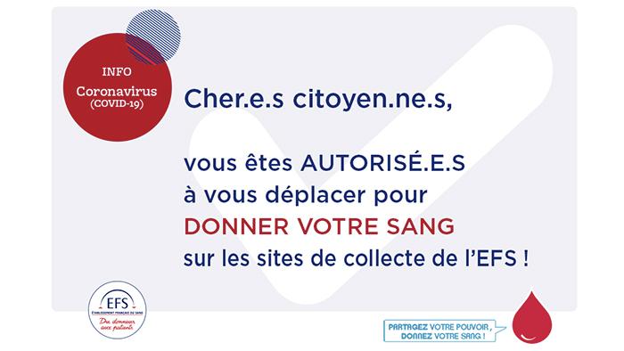 Toutes les mesures de précaution sont mises en œuvre sur les collectes de sang pour éviter les risques de transmission du virus avec le port du masque obligatoire pour tous, accompagné de mesures de distanciations et d’hygiène renforcées. Pour en savoir plus sur : https://dondesang.efs.sante.fr/don-de-sang-et-covid-19.