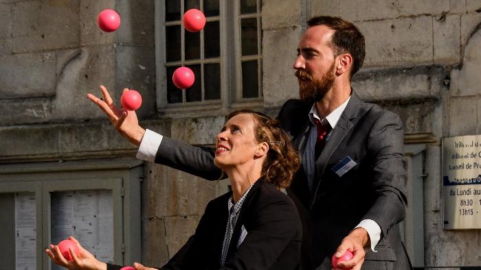 Ce duo théâtral et jonglé, sensible et humoristique vous est proposé par Juliette Hulot (Collectif Petit Travers / Le Boustrophédon) et Martin BdM (Compagnie Girouette / Cirque Hirsute), en coproduction avec La Cité du Cirque (Le Mans) et La Maison des Jonglages (La Courneuve).