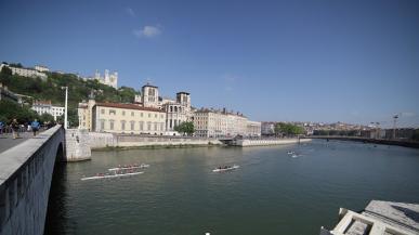 Venez découvrir l'ambiance d'une course d'aviron vers Saint-Jean, représentée par des bateaux des clubs de Lyon.